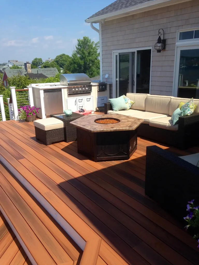 This open deck in Brazilian Cherry by DuraLife Decking & Railing uses minimalistic furniture and accessories to highlight the deck’s beautiful colors and shading.