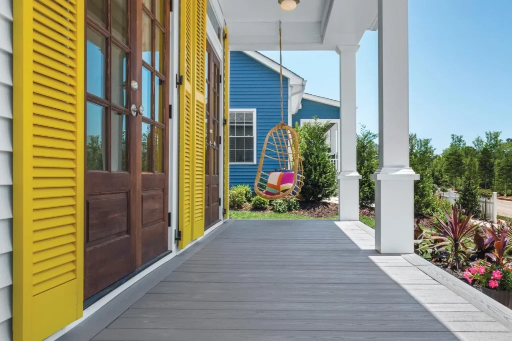 This TimberTech by AZEK deck in Slate Gray wouldn’t have the same visual impact with a mahogany- or walnut-colored surface. By using contrasting canary yellow shutters and a swinging chair, these homeowners gave their coastal-inspired deck a fun, relaxed look.