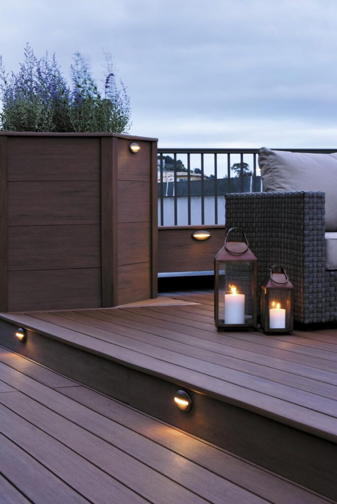 A darker look, using Mahogany from Timbertech by AZEK’s Vintage collection. Show off its rich, saturated color—even in the dark—with stair and rail lighting.