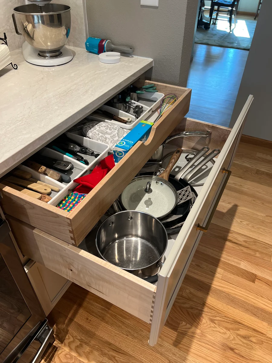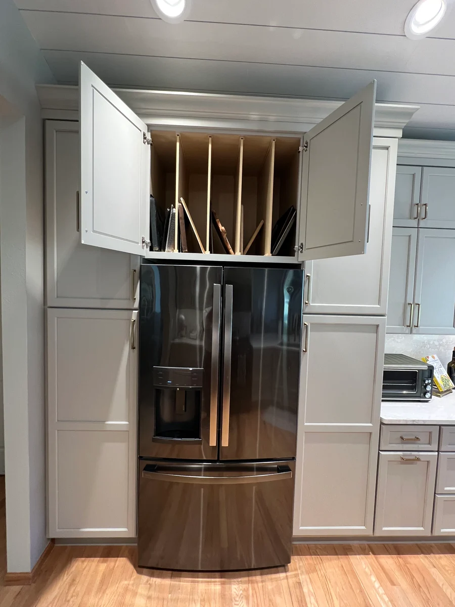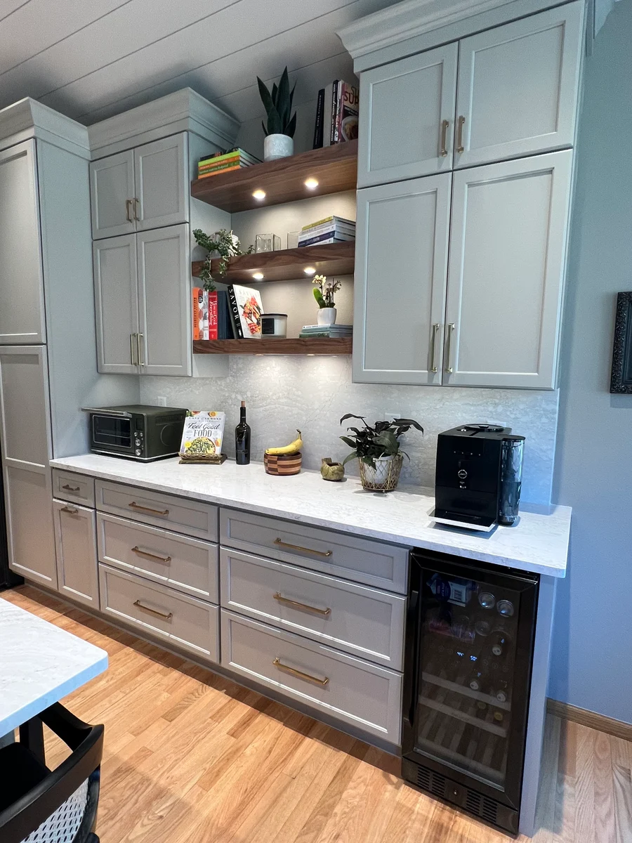 The variety of cabinetry and storage sizes and configurations keep the space uncluttered and organized. And the undercounter refrigerator? Chef’s kiss.