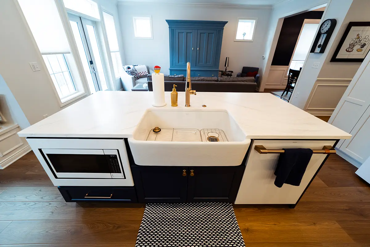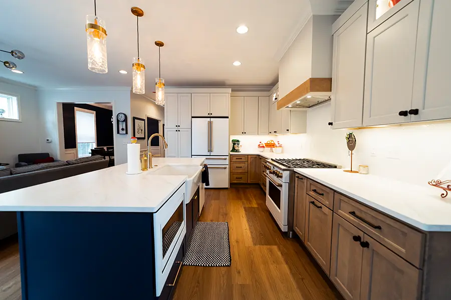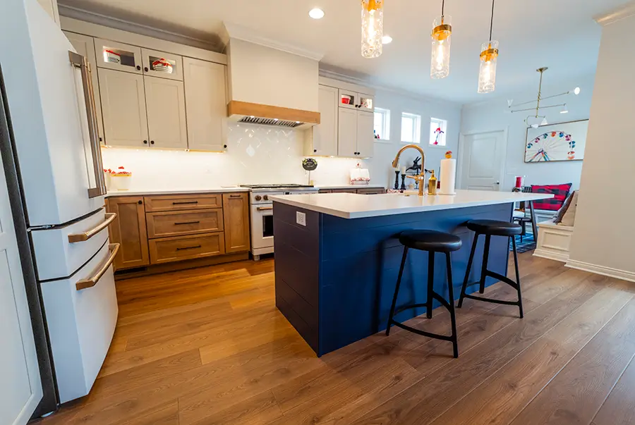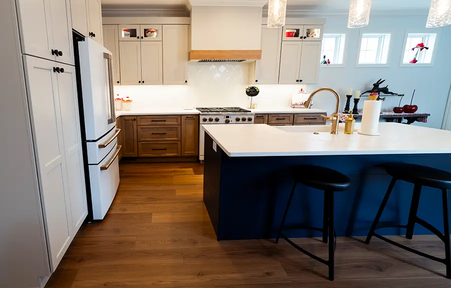 Bertch® Kitchens+ cabinetry in the Edgewood door style was chosen with a Sailcloth finish on the uppers to keep the space bright. For the lower cabinets, we went with Birch in Driftwood and a Cobalt island to add warmth and contrast at the center of the space. Extending cabinetry around the refrigerator created a more seamless, built-in appearance and helped center the design around the stove.