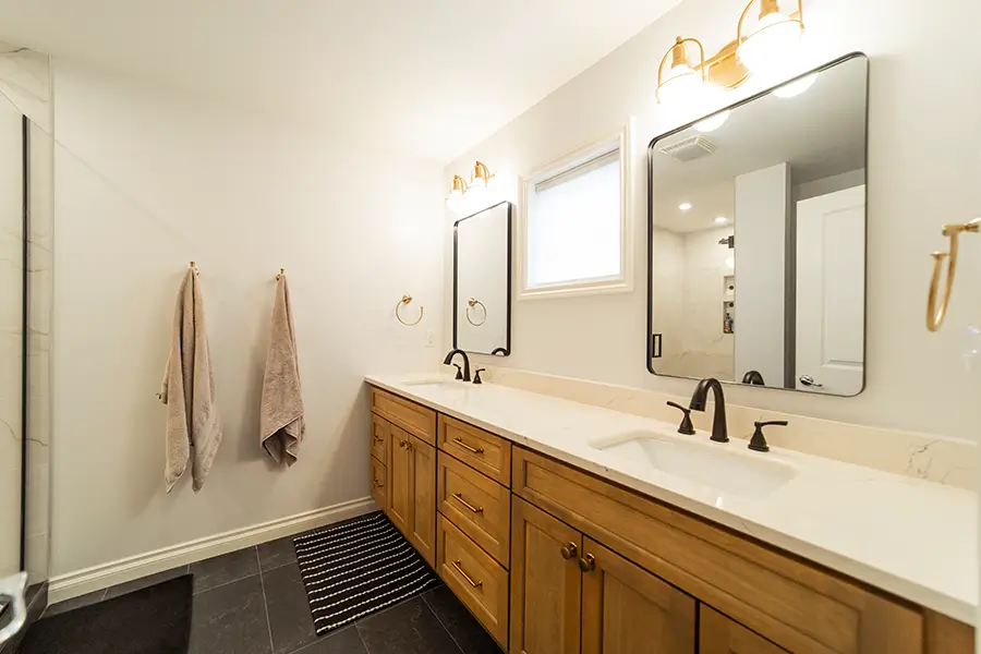 In the master bathroom, updated cabinetry and finishes were selected to introduce warmth and consistency.